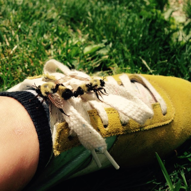 One day this summer, my undergraduate intern, Laine was lucky enough to have two bumble bee mimics land on her shoe (photo credit to Laine Feller). These are the mimics that tricked me. They looked strange so I sent the photo to Kelsey (my lab mate who has more bumble bee experience than I do). Kelsey immediately recognized the two insects as bee flies. The tell-tale sign? The wings. REAL bees have four wings (two forewings, two backwings). Bee MIMICS only have two.