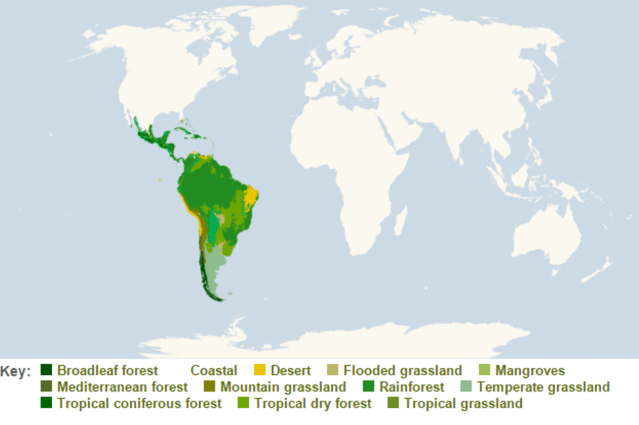Since I have a photo album dedicated to the neotropical pollinators that I was lucky enough to see, I figured I would write a post with some more detail about their diversity! First off, what does “neotropical” actually mean? Simply, it means Central and South America (shaded in the map below). More scientifically, “neotropical” is one of the Earth’s eight ecozones.