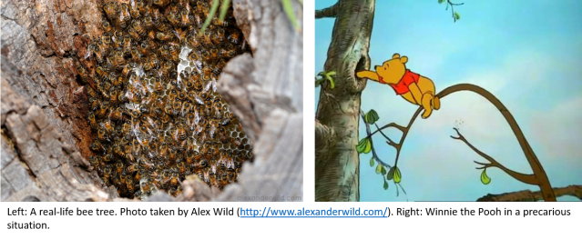 In nature, European honey bees (the type that are most commonly kept in the U.S.) nest in cavities. Winnie the Pooh illustrators did not always get this right. When Pooh sticks his hand into a tree for some honey, they’ve got it right! This tree is called a “bee tree.” In this hollow tree, resident bees build wax comb, raise their young, and store their food (Pooh is only interested in the honey).