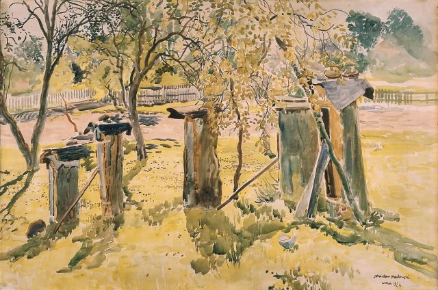 Bee hives made of mud and/or clay are still used in Egypt today. These tall, cylindrical hives are often made of a mixture of mud, straw, and even dung. In this 1924 watercolor by a Polish painter (and beekeeper?), these hives look like tree stumps. When you think about where bees naturally reside (bee trees!), this shape makes sense.