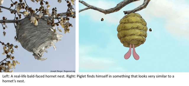 When Piglet gets himself stuck in a hive hanging from a tree, this is where things get biologically murky. While there are some honey bees that do nest in the open (such as Asian honey bees), they do not build nests like the one Piglet is stuck in. Asian honey bees build sheets of wax comb that hang vertically from a tree branch—there is no outside covering. The nest Piglet is stuck in looks more like a hornet’s nest. (This is unfortunate for Piglet: hornets are much more aggressive than honey bees.)