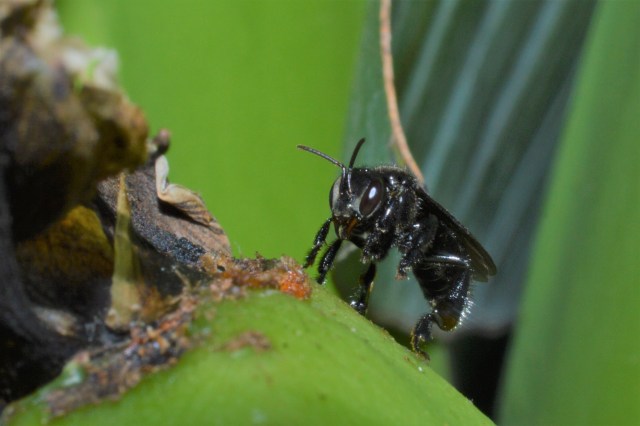 We put our heads together and thought about what we knew and what we wanted to know. We had spent our first days on the coffee farm locating stingless bee nests so we knew where to find stingless bee homes. We also knew that based on a paper by Greenleaf et al., “our” stingless bees should be able to find their way back home from up to about 100 meters (about 300 feet) away from their nest. This prediction had yet to be tested in the field. Thus, our new experiment began! We collected stingless bees from one of our nests, carefully paint-marked them, and watched (with a GoPro and some insect binoculars) as the bees returned home.