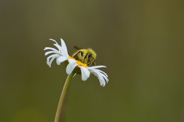 #NationalPollinatorWeek Day 2: male fuzzy-horned bumble #bee on oxeye daisy. Males cannot sting: the stinger is a modified egg-laying device, which males do not have. True for all male stinging #insects. Some males have defensive spikes instead.