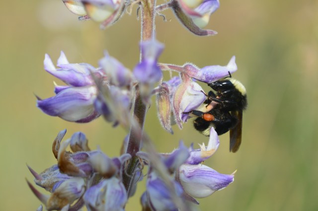 Day 6 of #NationalPollinatorWeek! Lupine is complicated to #pollinate. This yellow-faced bumble #bee steps on the outer petals to reveal the inner keel (where the #pollen is), hugs the keel, and buzzes to free that beautiful orange pollen.