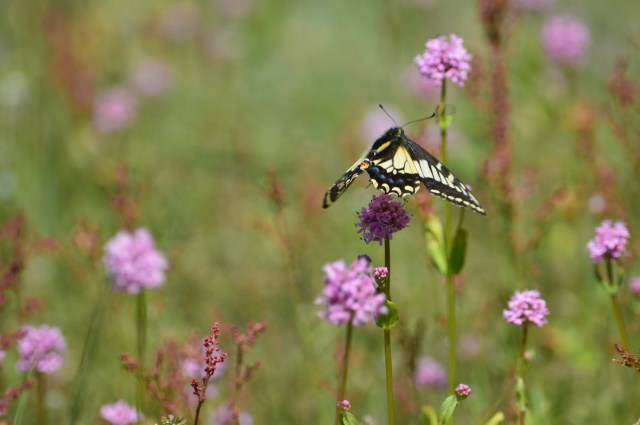 Day 4 of #NationalPollinatorWeek: an anise swallowtail #butterfly taking flight over a patch of onion flowers. The anise swallowtail gets its name from its penchant for laying eggs on an introduced plant, sweet fennel (aka anise).